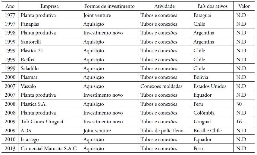 Enquanto no Uruguai “o motivo da instalação foi a facilidade de compra e manuseio de componentes químicos, principalmente para atender à subsidiária da Argentina” (Ibid.:9), na Colômbia o principal fator de atração foi o grande mercado interno e as altas taxas de crescimento econômico. O Peru também recebeu investimentos graças a variáveis macroeconômicas favoráveis, como inflação estabilizada e crescimento econômico acima da média na região (Nunes e Oliveira, 2010). Nos Estados Unidos, iniciou as operações comerciais no ano de 2007 e, em seguida, começou a produção em parceria com um produtor local de tubos e conexões. Em 2008, com a crise econômica, o grupo absorveu o parceiro estadunidense.