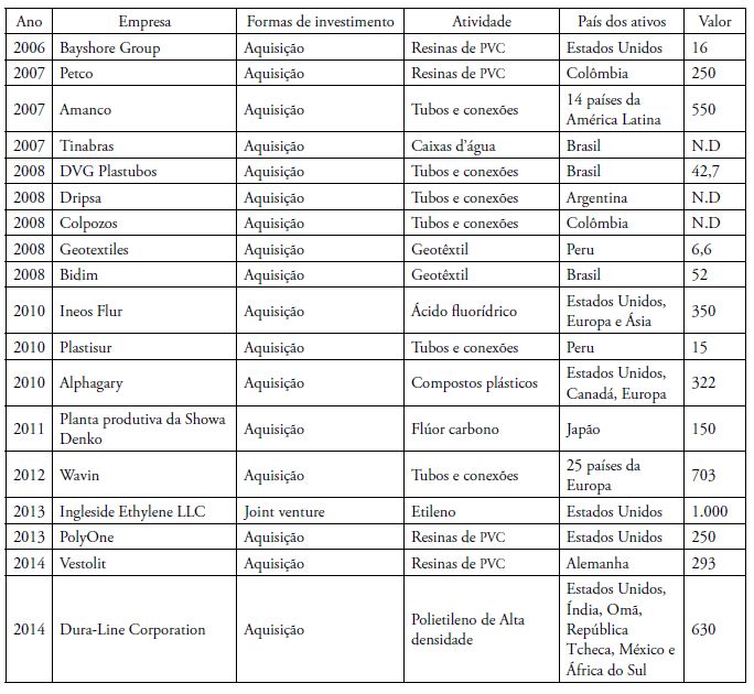 Nos anos 2000, o grupo manteve a trajetória de maior envolvimento internacional. Contudo, nota-se que houve uma estratégia mais agressiva de alargamento de seus circuitos espaciais de produção, como resposta ao avanço do Mexichem no Brasil. Nos mercados onde promoveu aquisições (Uruguai, Equador, Colômbia, etc.) já havia fluxos regulares de exportação anteriores e a estratégia do grupo consistiu em tornar-se um player relevante nos mercados selecionados (Equador e Peru, principalmente), com sucessivas aquisições e investimentos novos.