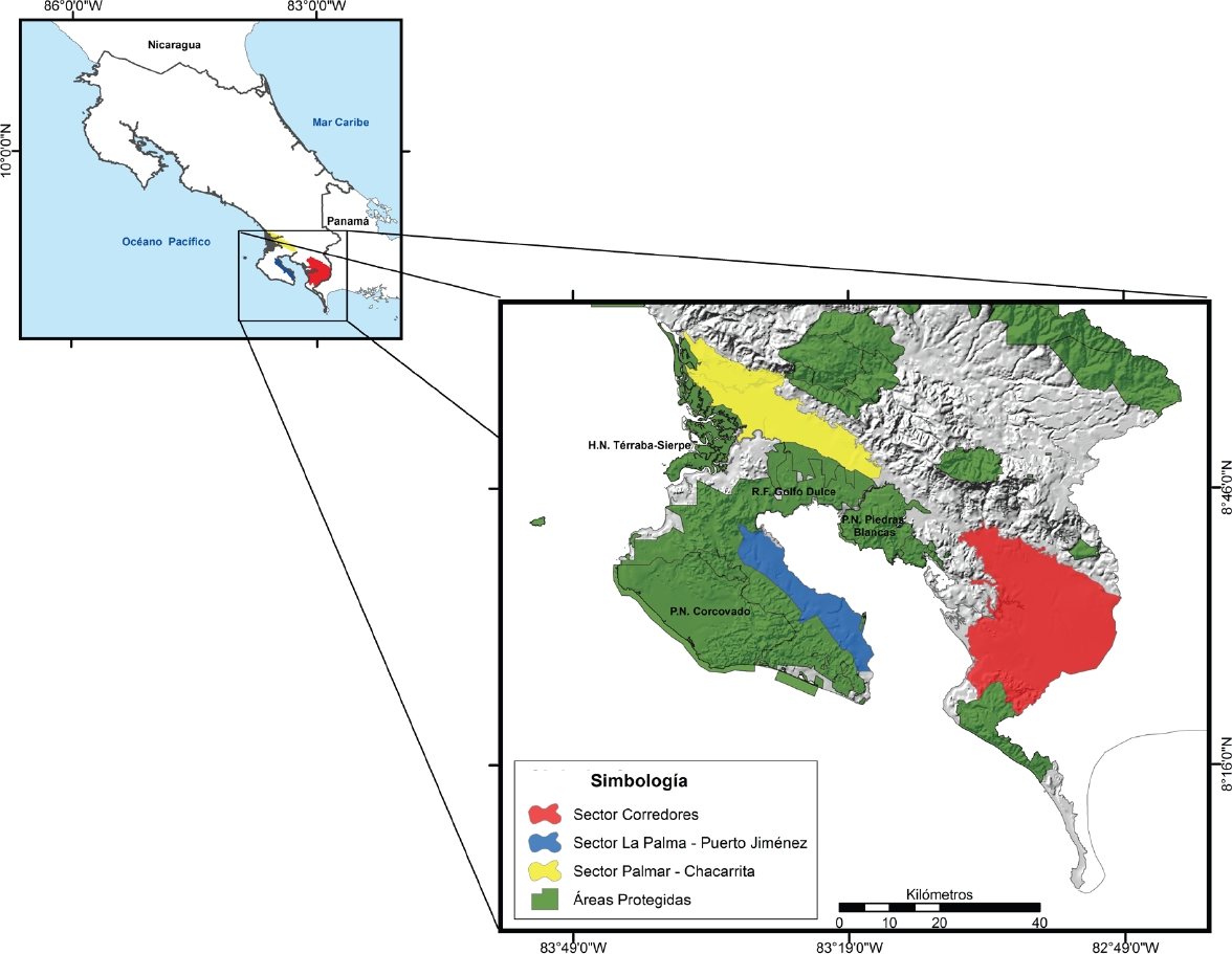 El estudio se desarrolló en la zona Pacífico Sur de Costa Rica, que comprende los cantones de Corredores, Golfito y Osa, entre las coordenadas geográficas 8o 16´ y 8o 59´ de latitud Norte, 82o 50´ y 83o 37´ de longitud Oeste (Figura 1). Los suelos estudiados son de uso agrícola, principalmente sembrados con palma aceitera, arroz, especies forestales y con distintos cultivos (denominados “cultivos varios” en el resto del documento), todos en una topografía variable entre 10 y 200 m.s.n.m. de la zona baja del Pacífico Sur que recibe una precipitación promedio anual de 4 954 mm (IMN, 2008).
