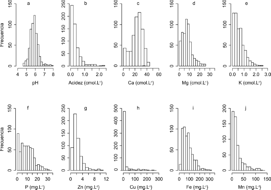 El análisis de frecuencias utilizado en las concentraciones de los diferencies nutrimentos en el suelo mostraron distribuciones anormales y tendencias entre los percentiles 25 y 75. El pH mostró la mayor distribución de muestras, que ronda entre 5.6 y 6.1, lo que indica una tendencia hacia pH más básicos (Figura 2a). El mayor número de muestras presentó acidez por debajo de 1.0 cmol(+).L−1; sin embargo, más de 25 muestras alcanzaron rangos superiores siendo estos suelos muy ácidos (Figura 2b). De las bases estudiadas, el Ca presentó valores entre 20 y 40 cmol(+).L−1 en el mayor número de muestras (Figura 2c), mientras que el Mg mostró la mayor distribución de muestras por debajo de 15 cmol(+).L−1 (Figura 2d) y el K por debajo de 1,0 cmol(+).L−1 (Figura 2e). El P presentó el mayor número de muestras inferiores a 20 mg.L−1 (Figura 2f). Así mismo, el Zn y Cu mostraron un mayor número de muestras por debajo del nivel crítico, donde el Zn mostró las mayores frecuencias de datos en valores por debajo de 4 mg.L−1 (Figura 2g) y el Cu en valores por debajo de 50 mg.L−1 (Figura 2h). El Fe mostró las mayores frecuencias entre 44 y 113 mg.L−1 (Figura 2i) en los cuartiles, mientras que el Mn presentó en los cuartiles una mayor frecuencia entre 8 a 28 mg.L−1 (Figura 2j).