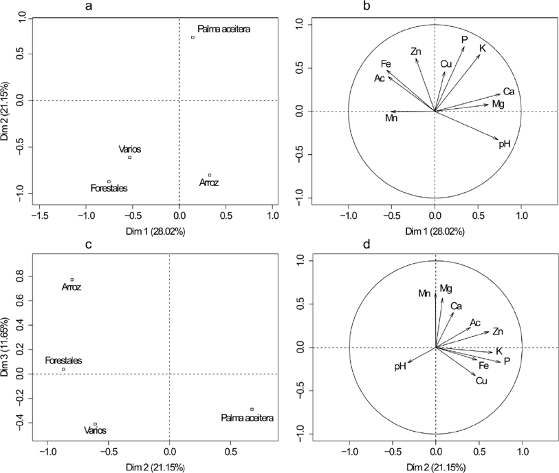 Con el fin de encontrar una posible estructura en la variabilidad de la base de datos, se realizó un análisis de componentes principales (CP). Dicho análisis mostró que las primeras tres dimensiones explican un 60.8% de la varianza de los nutrimentos del suelo en la región Pacífico Sur (Figura 3). La primera dimensión explica 28.0% de la variación del sistema, la segunda 21.1% y la tercera 11.7%. El análisis de CP separa los distintos cultivos, excepto forestales y cultivos varios que ocurren en coordenadas similares al comparar los CP1 y CP2, mientras que el de CP2 y CP3 presenta una separación similar, a excepción de forestales y arroz (Figura 3a-2c). Al parecer para el CP1 y el CP2, el P y el K extraíbles están mayormente correlacionados con el cultivo de palma aceitera e inversamente correlacionados con forestales y cultivos varios (Figura 3a-b). El pH parece estar correlacionado con el cultivo de arroz mientras que el Zn presentó una correlación inversa con este componente de cultivos varios. Al observar el mapa de factor de las variables incluidas en el análisis (Figura 3), los siguientes pares de elementos están altamente correlacionados: Ac con Fe, P con K, Ca con Mg (Figura 3b). Así mismo, el análisis de CP2 y CP3 mostró una correlación de Fe y Cu para el cultivo de palma aceitera (Figura 3c-d). El pH presentó una correlación con cultivos varios y una correlación inversa con Ca y Ac. Por último, en el mapa de factor de variables, los pares de nutrimentos Ac con Zn, Fe con Cu, P con K y Ca con Mg están altamente relacionados (Figura 3d).