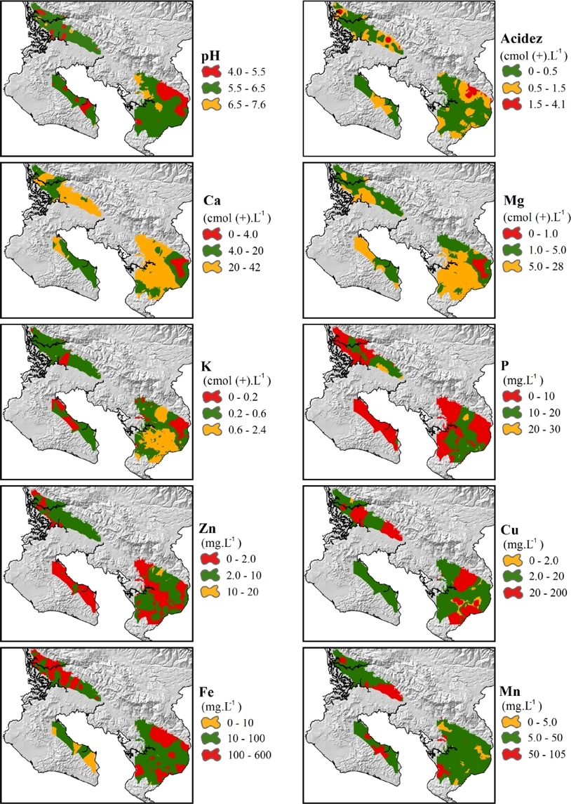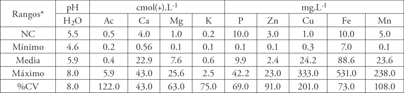 Las concentraciones de los nutrimentos analizados muestran una elevada variación (Cuadro 4) y los promedios tienden a presentar valores superiores a los niveles críticos (NC) definidos para la mayoría de los cultivos en Costa Rica (Bertsch et al., 2005). Para el Sector Palmar-Chacarita, Cordero y Miner (1975) mencionan niveles críticos de P específicos para arroz (4 mg.L−1) y para maíz (10 mg.L−1). Los coeficientes de variación (CV) encontrados de la acidez intercambiable, Cu y Mn, son superiores al 108% y, por ende, poco confiables, mientras que para las variables pH y Ca los CV son inferiores al 43% (Cuadro 2), todos dentro de los rangos de suficiencia definidos para las regiones según reportan varios autores (Holdridge et al., 1971; Más, 1981; Berstch, 1986; López y Solís, 1992; Pedrosa, 1995; TAHAL, 2000; Flores, 2001; Ramírez, 2008; Méndez y Bertsch, 2012) (Cuadro 4).