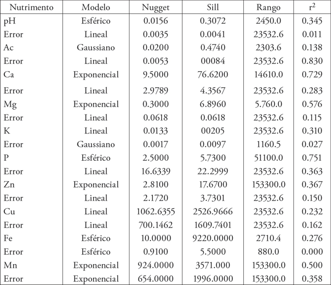 Los análisis de suelos localizados dentro de las divisiones Jiménez, Palmar y Coto se sometieron a un análisis geoestadístico exploratorio para determinar los modelos de mejor ajuste para cada variable. Las concentraciones de nutrimentos fueron separadas en una variable Z (datos nutricionales) con las respectivas coordenadas planas X, Y, para evaluar las auto-correlaciones espaciales inherentes de los datos. Los datos fueron procesados mediante el programa GS+ Geostatistic for Environmental Science (versión 9) donde se analizaron los semivariogramas y se estimó el modelo con el mejor ajuste (r2) (Cuadros 1, 2 y 3). Una vez establecidos los modelos de ajustes para las variables Z las mismas se interpolaron por el método de Kriging ordinario empleando el programa ArcGis 10.1 (Ecuación 1):
