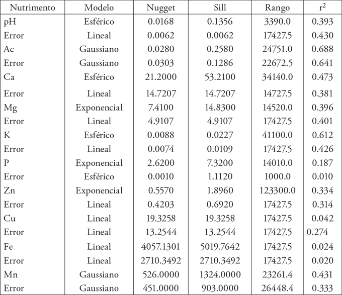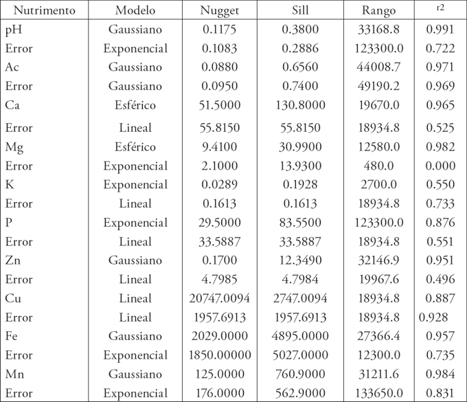 Se encontró una mejor distribución ajustada en la interpolación cuando se validaron los paráda en comparación con la validación de campo (Cuadro 8). Los promedios interpolados mostraron un mejor ajuste al presentar una mayor aproximación de cada concentración de nutrimento, cuando se utilizó la validación cruzada con 5% de los análisis químicos del Pacífico Sur en comparación con la validación de campo efectuada en el 2014. Así mismo, el promedio absoluto del error (PAE) y el promedio del cuadrado del error (PCE) mostraron una mayor aproximación a 0 cuando se utilizó la validación cruzada y obtuvo un mejor estimado de predicción (E) para todos los nutrimentos. Al calcular el error para cada interpolación, los parámetros estadísticos (PAE, PCE, E y coeficiente de correlación) mejoraron para la validación de campo y la validación cruzada, demostrando que al restar los errores interpolados a los datos reales interpolados mejoran el ajuste de la interpolación en todos los nutrimentos del sistema. Al comparar la validación de campo y la validación cruzada con la resta de los errores interpolados se encontró una mejora en los parámetros estadísticos cuando se utilizó la validación cruzada del Kriging menos los errores de interpolación. Por último, se encontró que la predicción de la concentración de los nutrimentos es mejor para los macronutrimentos que para los micronutrimentos, en función de la variación que se encuentra a niveles de análisis de laboratorio para los micronutrimentos (Corrales et al., 2005), lo que efectúa una correspondencia precisa con el meta-análisis.