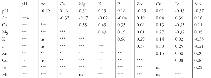 El análisis multivariado mostró correlaciones entre los distintos nutrimentos según la prueba de Spearman; se encontró una correlación positiva entre las bases Ca, Mg y K (Cuadro 7) con coeficientes de correlación (Coe > 0.43, valor p < 0001), una correlación inversamente proporcional ente pH y Acidez Intercambiable (Coe −0.69, valor p <0001) y altos coeficientes de correlación entre K y P (Coe 0.66 valor p < 0.001) y entre el pH y Ca (Coe 0.46, valor p < 0.001). Se observaron tos con coeficientes que varían desde −0.43 hasta 0.37 (Cuadro 7).