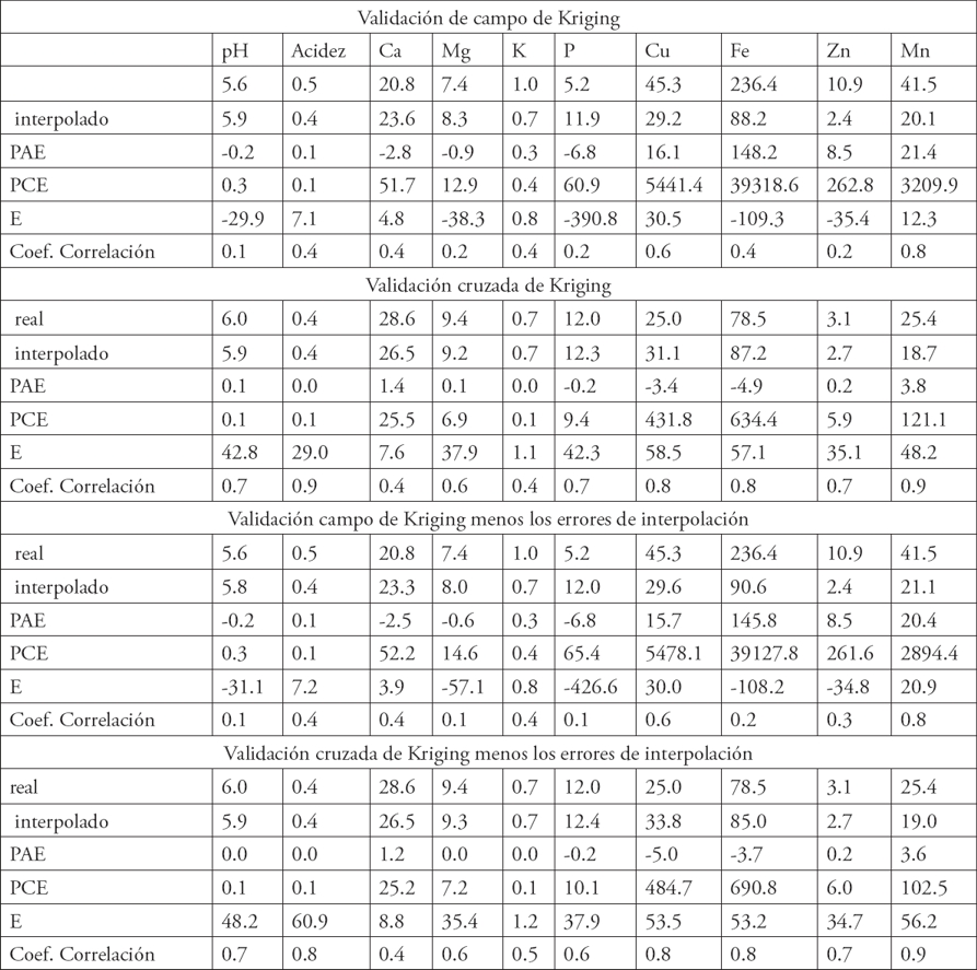 La validación de las interpolaciones se realizó con las metodologías de campo y cruzada descritas por Henríquez et al. (2013). La validación de campo consistió en recopilar análisis de suelos realizados en el año 2014 y compararlos con los datos interpolados mediante el método Kriging. La validación cruzada consistió en extraer 5% de los análisis de suelos colectados para validar las interpolaciones efectuadas en ausencia de estos datos; se realizó una nueva interpolación y consecutivamente se ubicó las coordenadas de los datos ausentes para compararlos con los datos interpolados. Por otro lado, se realizó otro tipo de validación donde a las interpolaciones se les extrajeron los errores calculados para cada observación y se restó al valor original de cada observación con el fin de obtener un mejor ajuste en las interpolaciones; al nuevo valor se le realizó un análisis geoestadístico y se interpoló mediante el método de Kriging ordinario y posteriormente se restó empleando la ecuación (2) de McBratney et al. (2003). Para las cuatro validaciones se calcularon el promedio real de los datos de validación de campo y del 5% de los datos en validación cruzada, promedio interpolado, promedio absoluto del error (PAE), promedio del cuadrado del error (PCE), estimado de efectividad de predicción (E) y coeficiente de correlación según la metodología descrita por varios autores (Schoeder et al., 2001; Villatoro et al., 2008):