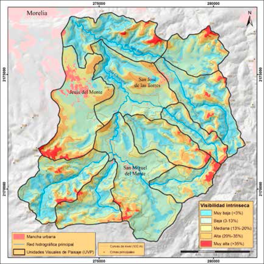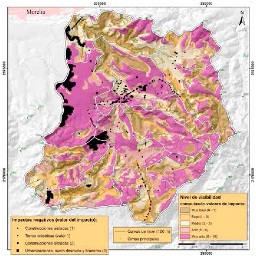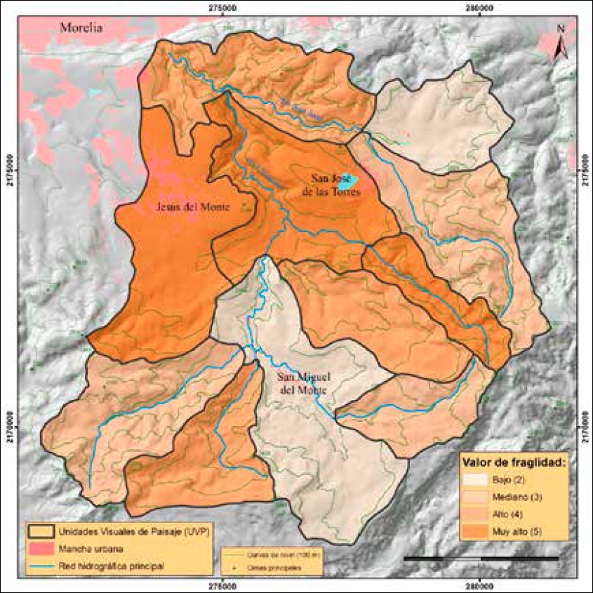 Las UVP con valores de fragilidad más elevados correspondieron a las noroccidentales, es decir, las más próximas a la ciudad de Morelia y sobre las que se asientan las localidades más pobladas. También mostraron datos muy elevados las UVP que poseen mayores índices de visibilidad intrínseca (las UVP más montañosas).