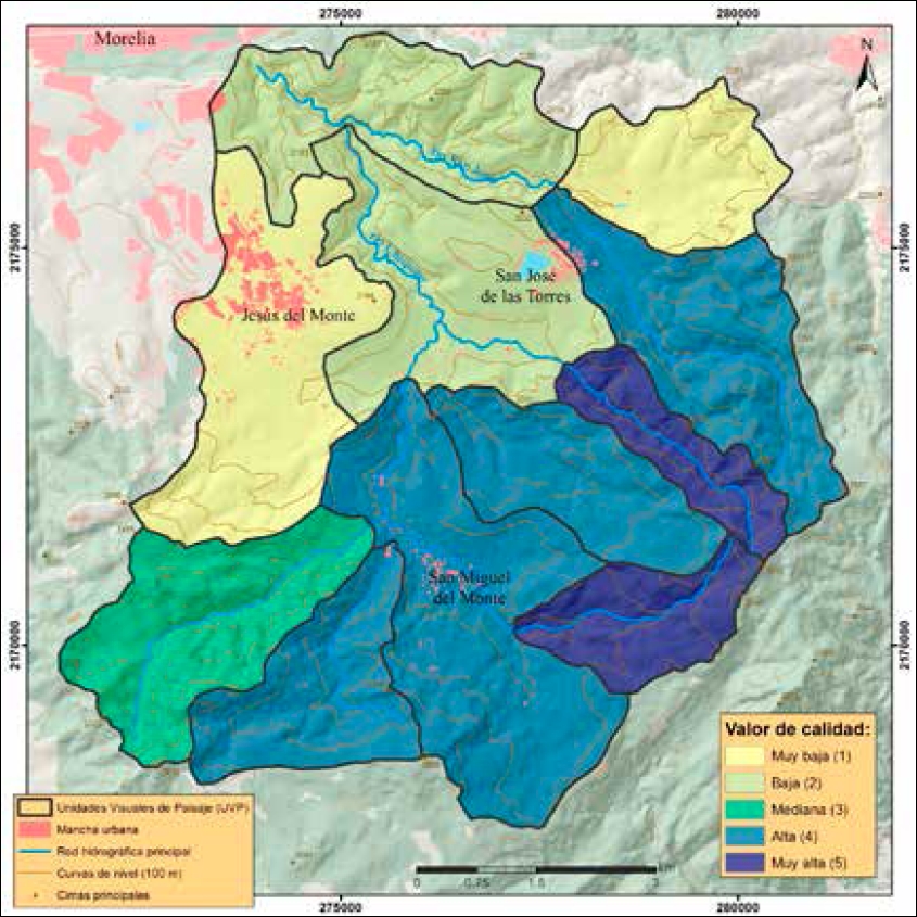 En México, pese a todo ello, son escasos los trabajos realizados bajo dicho enfoque, tanto aplicados como de carácter teórico-conceptual, motivo por el cual este trabajo ha recorrido el estado de la cuestión en los estudios paisajísticos con la variable visual en territorio mexicano y ha llevado a cabo un caso aplicado en un área, la cuenca del río Chiquito (Morelia, Michoacán), de reconocido valor ambiental y que, a su vez, se ve sometida a la presión de la progresiva expansión urbana de la ciudad de Morelia. Se ha utilizado un método indirecto de análisis y valoración con enfoque cuantitativo, considerando que es la mejor forma de evitar apreciaciones subjetivas a través de la estimación objetivable de determinados parámetros con incidencia paisajística, lo cual resulta afín al propósito de incorporar los estudios de paisaje a las políticas de gestión territorial mexicanas. De acuerdo con esto, se ha trabajado a escala 1:25 000, entendiendo que el nivel de detalle a escala local era fundamental.
