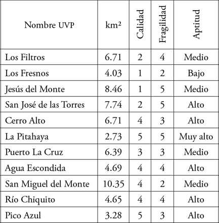 En una primera aproximación, la aptitud genérica del territorio desde la perspectiva paisajística vendrá determinada por el cruce de las valoraciones de calidad y fragilidad, mediante una matriz de doble entrada (Tabla 1). De esta manera, y por poner ejemplos significativos, una zona de alta calidad y alta fragilidad tendrá aptitud paisajística distinta a otra con baja calidad y baja fragilidad. En el primer caso, parecería lógico intentar preservarla de actuaciones degradantes. Los resultados obtenidos muestran la aptitud paisajística para cada una de las UVP de la cuenca del río Chiquito (Figura 7). La UVP con los valores más altos de calidad y fragilidad es La Pitahaya, seguida de las unidades San José de las Torres, Cerro Alto, Agua Escondida, Río Chiquito y Pico Azul, con valores altos en el cómputo total de ambas variables. Estas seis UVP han sido calificadas con valores de aptitud alto y muy alto, lo cual aconsejaría fuesen preservadas de actuaciones impactantes, procurándose el mantenimiento de su actual estatus paisajístico. La UVP con valores más bajos de calidad y fragilidad corresponde a Los Fresnos. Es, por lo tanto, una UVPcon elevada aptitud para acoger actuaciones con incidencia territorial sin grave quebranto paisajístico. Por último, las UVP que poseen valores intermedios de aptitud son Los Filtros viejos, Jesús del Monte, Puerto La Cruz y San Miguel del Monte. Conviene reseñar, para la UVP Jesús del Monte, que la expansión de la mancha urbana de Morelia amenaza por el noroeste, precisamente en la posición que ocupa esta UVP, por lo que es la más amenazada y la que presenta mayor probabilidad de cambio.