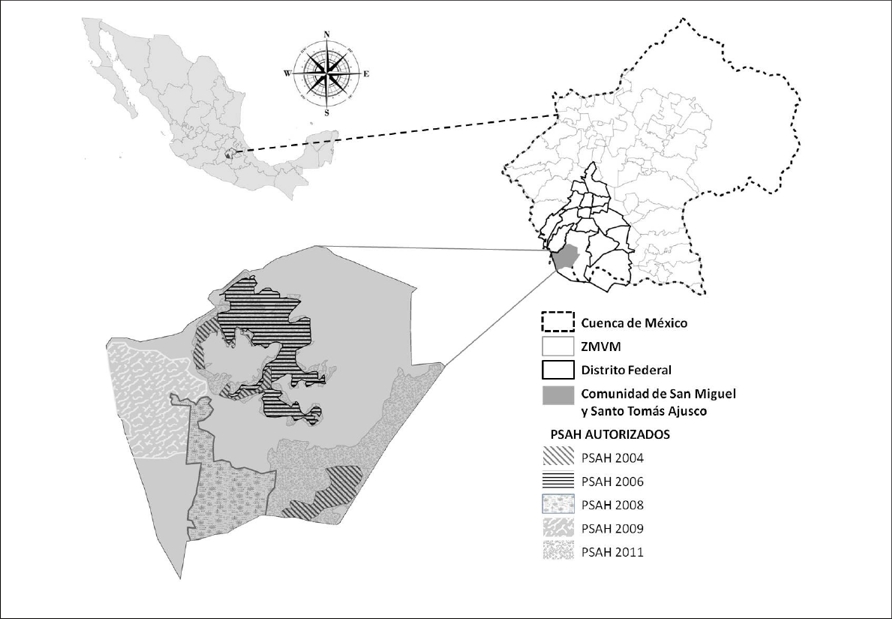 La comunidad de San Miguel y Santo Tomás Ajusco se ubica al suroeste del Distrito Federal (DF), ahora la Ciudad de México1 (Figura 1). Geográficamente, corresponde con el parteaguas de la Cuenca de México (una formación hidrográfica cerrada), que cuenta con un clima semifrío, sub-húmedo, y verano fresco. Estas condiciones climatológicas y orográficas favorecen la existencia de una gran diversidad de flora y fauna que proporcionan múltiples SE a escala regional, como la preservación de la biodiversidad, el mantenimiento del ciclo hídrico, resaltando la captación de agua para la recarga de flujos de agua subterránea, la captura y almacén de carbono, las actividades recreativas en un entorno natural, entre otras (PAOT-SMA, 2012). Por otro lado, es importante comentar que la Ciudad de México es una entidad dinámica, en constante crecimiento y expansión, que presenta serios problemas ambientales de contaminación, pérdida de ecosistemas y erosión de suelo, etc. (Aguilar y Santos, 2011).