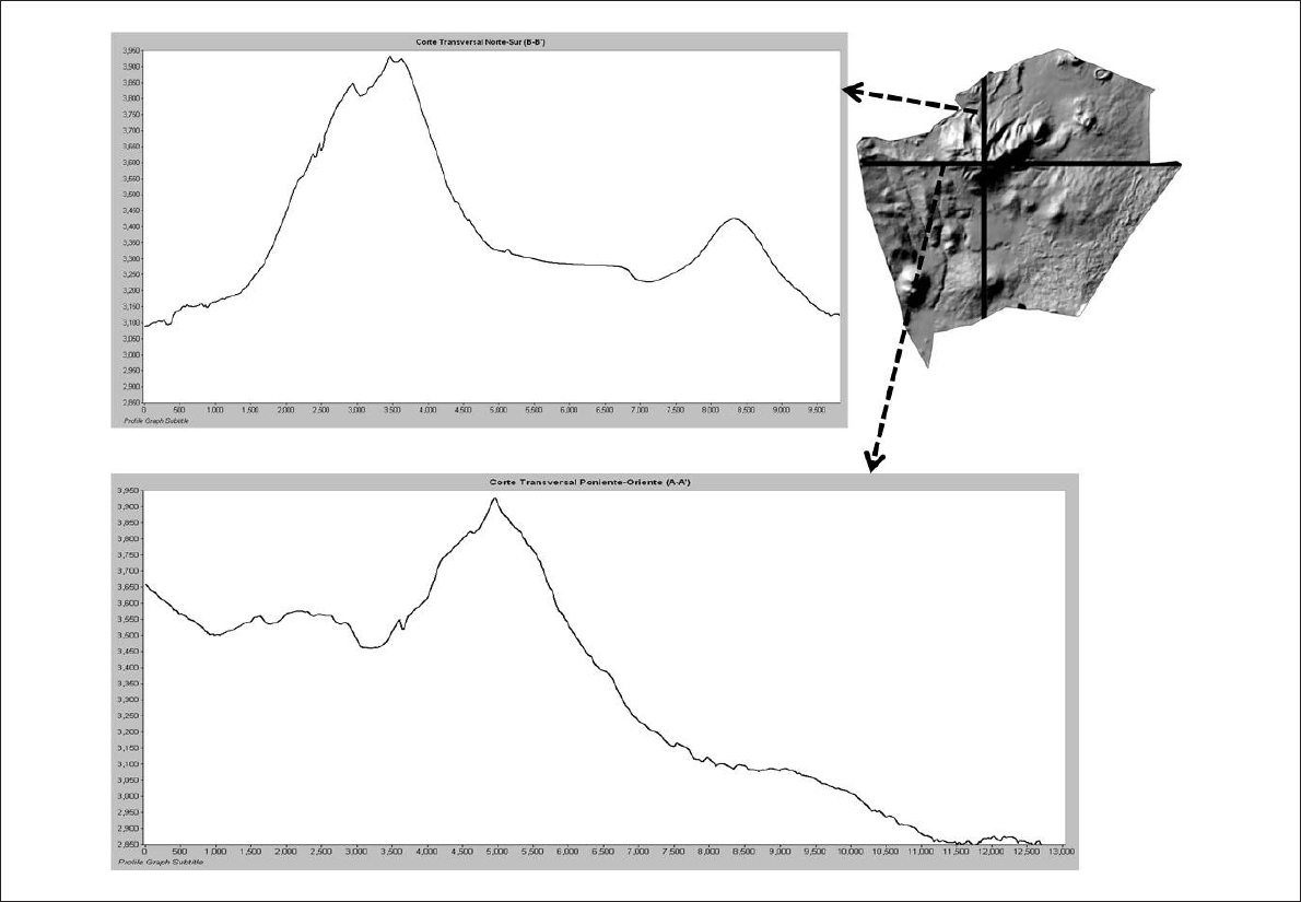 Construcción de perfiles. En esta fase se trazaron dos perfiles longitudinales con diferentes orientaciones, considerando como punto de intersección el punto de mayor altitud de la zona; los perfiles se generaron de poniente a oriente (perfil A-A’) y de norte a sur (perfil B-B’) (Figura 2), porque, de esta manera, se observó (al hacer varias pruebas de despliegue de capas en el SIG) que representaban la mayoría de las topoformas y usos de suelo presentes en la zona de estudio. Para obtener gráficamente los perfiles se utilizaron el modelo de elevación digital y el módulo 3D Analyst (herramientas Interpolate line y Profile Graph) del software Arc Map 10.1.