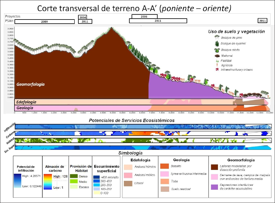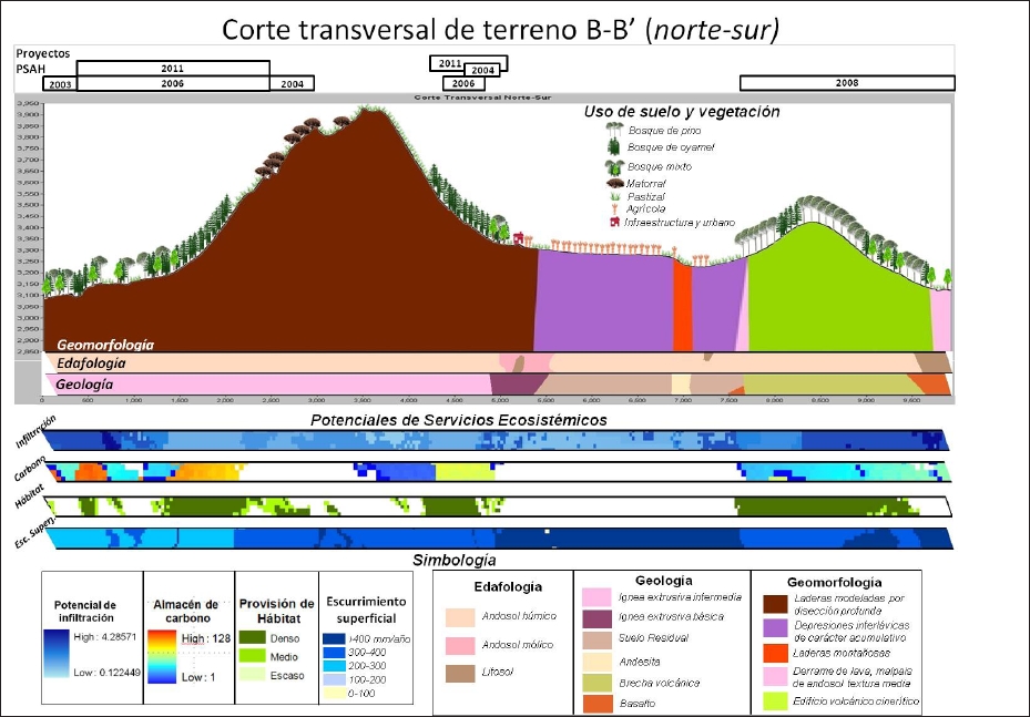 Agregación de coberturas (capas de información cartográfica) y análisis integrado. En esta etapa se procedió a generar una imagen que permitiera visualizar los perfiles longitudinales junto con la información de capas temáticas preseleccionadas de la Tabla 1. Se consideraron específicamente las siguientes variables: los sitios autorizados de PSAH; uso del suelo y vegetación; geomorfología; edafología y geología; servicios ambientales de almacén de carbono; potencial de infiltración; escurrimiento superficial y provisión de hábitat (que considera la vegetación forestal constante en superficie y densidad durante un periodo de 20 años, lo que implica la posibilidad de mayor biodiversidad nativa). Para el despliegue de las coberturas se creó un proyecto en el software Arc Map 10.1, estandarizando las capas en Proyección Universal Transversal de Mercator (UTM), con datum WGS84. En todos los casos las capas se recortaron al tamaño del polígono de la Comunidad de San Miguel y Santo Tomás Ajusco, recalculando las superficies; en donde fue necesario se hizo la conversión de raster a shapefile, previo al análisis.