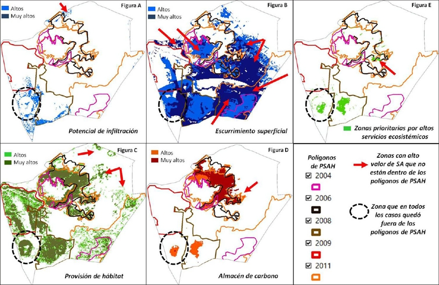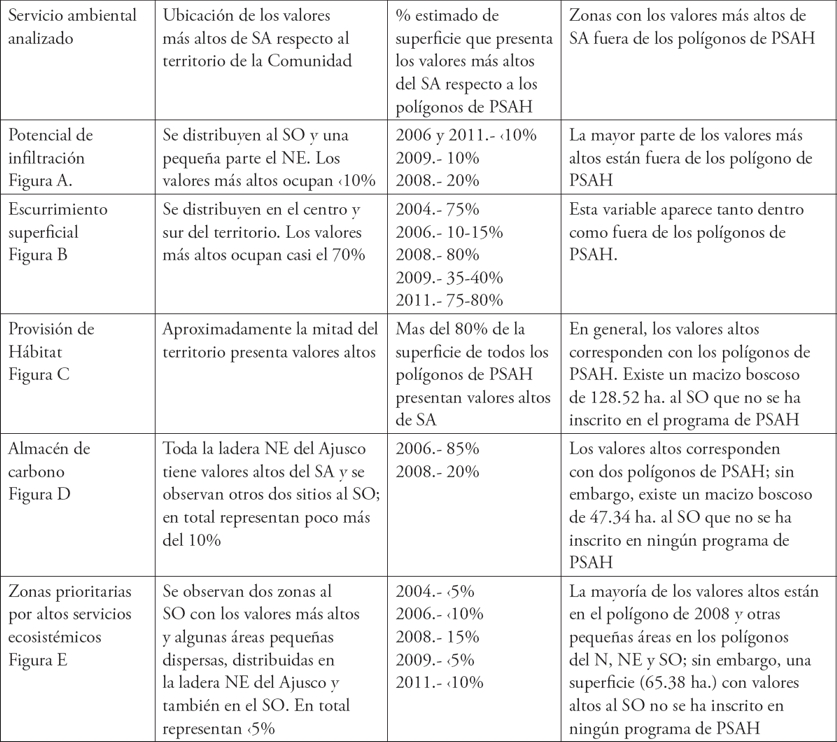 Al revisar todos los polígonos de PSAH contra los valores de servicios ambientales, resultan evidentes otras potencialidades (incluso superiores a los valores de los hidrológicos), como el almacén de carbono y la provisión de hábitat. Este último asocia la densidad arbórea que se ha mantenido constante en espesor y superficie, por lo que se puede relacionar con la presencia de biodiversidad o zonas menos perturbadas. Como se dijo en la metodología, para el análisis se seleccionaron las categorías con valores más altos de cada capa de servicios ambientales. En el Cuadro 2 y en la Figura 5 se aprecian estas zonas con respecto a los polígonos autorizados de PSAH (que fueron fusionados dando lugar a un sólo polígono), y es preocupante que hay áreas que quedaron fuera de este programa y otras, con valores no tan altos, que se han mantenido dentro del polígono de PSAH.
