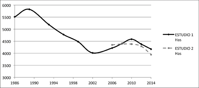 Para complementar el ejercicio anterior se optó por revisar la información sobre cobertura forestal a partir de dos estudios disponibles (PAOT-Centro-Geo, 2010, 2014), con la finalidad de identificar si el programa de PSAH ha contribuido a detener el problema de la deforestación. Aunque los datos de los dos estudios no son comparables debido a la metodología que se utilizó para su clasificación, el análisis espacial, visual y estadístico de los datos que contienen, permite identificar una tendencia de la deforestación de 215 hectáreas por año en este territorio. A pesar de eso, se observó que la deforestación no ha tenido el mismo comportamiento durante todo este periodo, como se puede observar en la Figura 6. Se observó que entre los años 2002 y 2006 no sólo se detuvo la pérdida de cubierta forestal, sino que aumentó la superficie vegetal (PAOT-CentroGeo, 2010), luego se mantuvo constante la cobertura (PAOT-CentroGeo, 2014) y, finalmente, disminuyó a partir de los años 2010 y 2012.