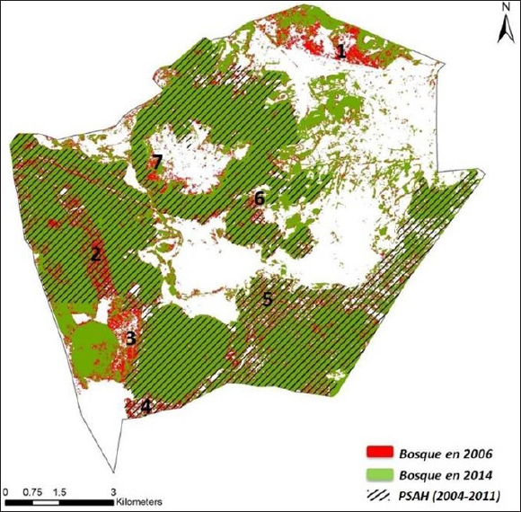 ES mapping was deployed with PHES polygons and correspondence between sites on PHES and areas with greatest potential for ES (except for an area of 236.7 hectares) was found. However, in many cases, the highest values of ES not correspond to water resources, as they are more associated with vegetation and biodiversity (carbon stock in forestsand provision of habitat), which helps to conclude that the PHES program should consider other variables and not be restricted to the ES associated with hydrology. Two studies on quantifying forest cover were reviewed in the area (one covers from 1986 to 2010, with a projection to 2030 and the other from 2006 to 2014). The information regarding sites on PHES Program and the result shows that deforestation has remained revised (although the rate decreased in the period 2006-2014) and deforested areas within enrolled in the program areas PHES are greater than those who have not been. Although factors that could contribute to the process are identified, it is concluded that a program like PHES implemented in an isolated manner, has no bearing on the problem of deforestation. Finally, the importance of obtaining the map “high priority areas for ecosystem services”, the most environmentally important areas are identified and this helps manage PHES expanding areas and get other resources or protection status in areas with natural ecosystems.