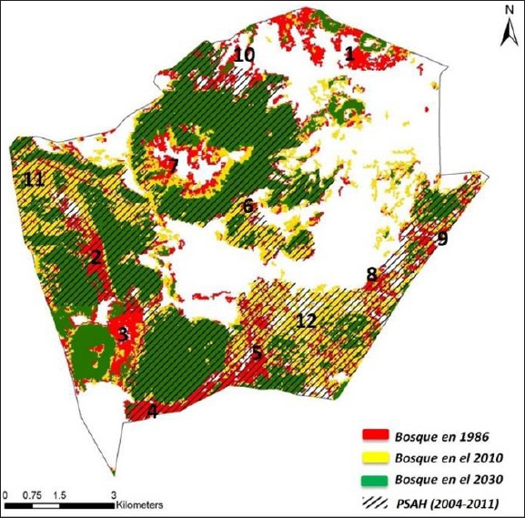 En la Figura 8 se aprovecha la proyección al 2030 para no sólo resaltar las zonas deforestadas al 2010, sino identificar las que posiblemente se perderán de continuar estas tendencias. Por otro lado, como se puede observar, tanto en el mapa como en la gráfica, el programa de PSAH no ha podido frenar la deforestación y las zonas donde se observó la mayor pérdida de cubierta forestal están en los límites entre los macizos boscosos y otros usos del suelo. Asimismo, se indican con números del 1 al 10 los lugares donde se ha dado la mayor pérdida de arbolado. El número 1 es la zona con más superficie de pérdida; los sitios del 1 al 7 tienen coincidencia en ambos estudios; los sitios del 8 al 12 son los que podrían aparecer en un futuro considerando el dato de la proyección al 2030. En los sitios 2, 4, 5, 6, 10, 11 y 12 se presenta deforestación a pesar de estar inscritos en PSAH, lo que se confirma con las gráficas de apoyo de las Figuras 7 y 8, donde al diferenciar la superficie de pérdida de vegetación de las zonas dentro de los polígonos y fuera de ellos, se observa que las superficies deforestadas son mayores en las zonas inscritas al programa PSAH que en el resto del territorio de la comunidad (no se considera en este análisis el polígono de PSAH por año, por lo que existe la posibilidad de que la deforestación en esos sitios se haya dado una vez que el programa concluyó su vigencia). Esto indica que el programa de PSAH no ha podido tener una incidencia importante en la problemática de la deforestación en la zona y la proyección indica que se perderá más superficie arbolada, por lo que es necesario tomar medidas inter e intra sectoriales para evitar ese escenario.