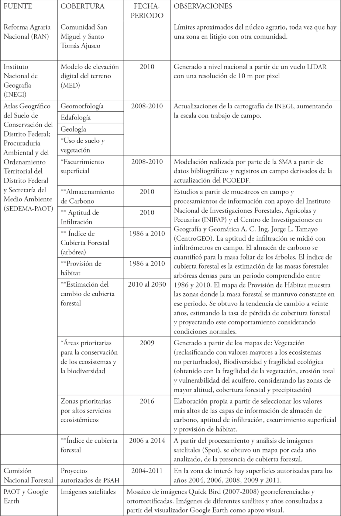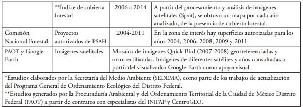 Las capas temáticas fueron obtenidas en su mayoría del Sistema de Información Geográfica de la Procuraduría Ambiental y del Ordenamiento Territorial de la Ciudad de México (SIG-PAOT), así como del Atlas Geográfico del Suelo de Conservación del Distrito Federal (PAOT-SMA, 2012), dado que cuentan con metadatos estandarizadas.