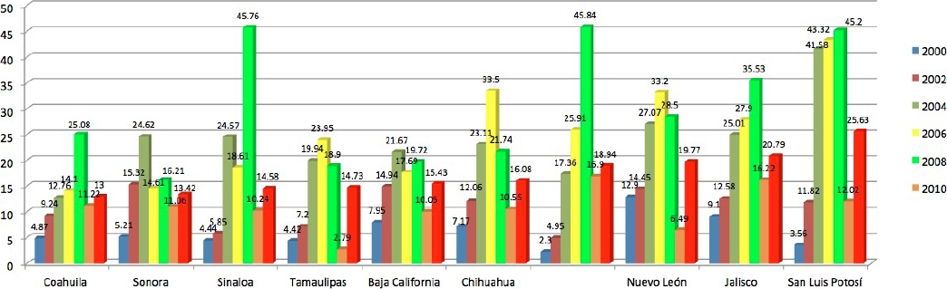 Las variables utilizadas, en primera instancia, para realizar el análisis espacial y estadístico para relacionarlas con la presencia de cáncer de mama fueron: las tasas de mortalidad y morbilidad más altas y el total de defunciones debido al cáncer de mama presentes entre la población femenina de 14 años y más por estado. El análisis de la evolución temporal de estas variables, a partir del año 2000, obtenidas de las principales instituciones de salud y del INEGI (SUIVE, SS, INEGI, 2000-2010), permitió identificar y delimitar las doce entidades que, de manera sostenida, presentaron las tasas más altas a lo largo de doce años, así como los municipios donde se registraron los datos más relevantes de este padecimiento en el mismo periodo, destacando los estados de Baja California Sur, Sonora, Chihuahua, San Luis Potosí, Jalisco y Nuevo León. También se seleccionaron los doce estados con las tasas más bajas al respecto, para determinar qué municipios de estas entidades federativas presentaron los datos de mortalidad y morbilidad más significativos y encontrar, en un análisis posterior, las coincidencias o divergencias que presentaron ambos espacios antagónicos (véanse figuras 1, 2, 3 y 4). Las entidades que se desatacaron por tener los datos menos significativos son Oaxaca, Chiapas y Quinta Roo1 (Figura 5).