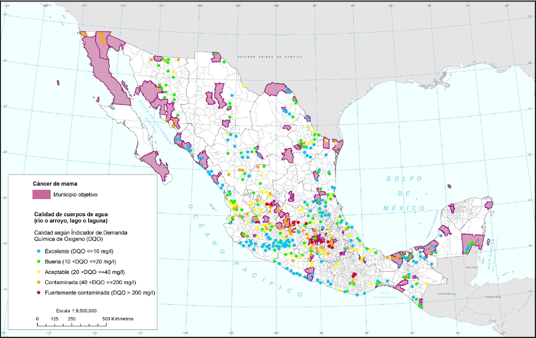 Una de las variables más importantes en el desarrollo del estudio fue la relación espacial entre los municipios con presencia de cuerpos acuíferos (ríos, arroyos, lagos o lagunas) altamente contaminados y los municipios objetivo, tomando en cuenta la clasificación de la CONAGUA, dependencia que utiliza tres indicadores en sus mediciones: demanda bioquímica de oxígeno a cinco días (DBO5), demanda química de oxígeno (DQO) y los sólidos suspendidos totales (SST) (CONAGUA, 2012). Al conjuntar estos tres indicadores, la CONAGUA muestra los espacios marcados como severamente contaminados, ubicados en treinta seis de los municipios objetivo, que equivalen al 59% del total de los sesenta y un municipios seleccionados conforme las estadísticas más relevantes de cáncer de mama.