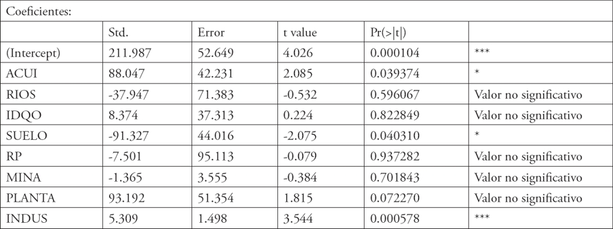lm(formula = OCC ~ ACUI + RIOS + IDQO + SUELO + RP + MINA + PLANTA + INDUS)