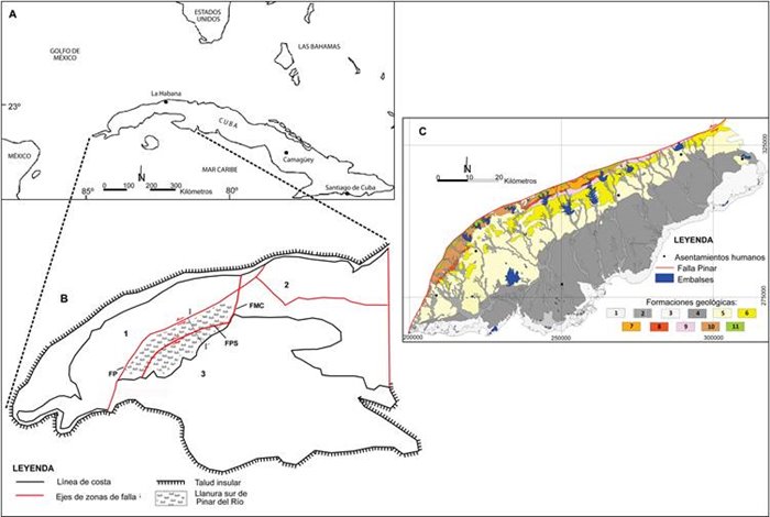 La llanura sur de Pinar del Río se ubica en la región suroccidental de Cuba (Figura 1A y B). Sus límites norte y oeste los constituye la falla Pinar, estructura tectónica de desplazamiento horizontal izquierdo, con componente normal y rumbo NE-SW. Esta dislocación, de larga duración, inicia su actividad al concluir los sobrecorrimientos laramídicos, desde inicios del Paleógeno al presente (Cobiella, 2008), manifestando cambios cinemáticos en sus desplazamientos (Cofiño y Cáceres, 2003; Cruz et al., 2007), activa en la actualidad (McGillavry, 1970; Gordon et al., 1997). El límite sur del área está configurado por la costa del Mar Caribe, mientras al este la llanura coincide con la transición de los sedimentos aluviales a marinos de las formaciones terrígenas Guane y Guevara hacia sedimentos carbonatados.