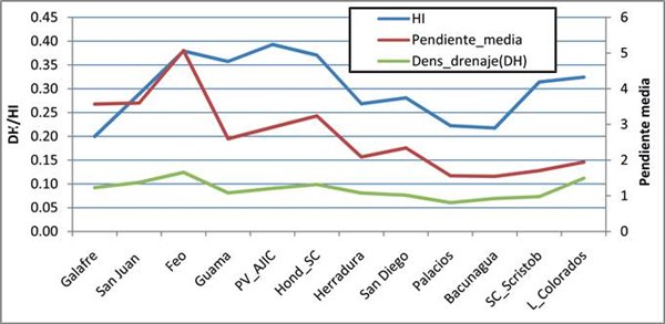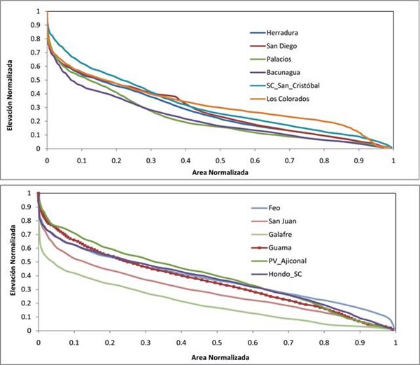Estas curvas indican la proporción área/altitud y permiten comparar cuencas de diferentes tamaños. Cuando estas se apartan de las teóricas o presentan más de un punto de inflexión se pueden relacionar con controles tectónicos o litológicos. Para calcular este índice (Mayer, 1990; Keller y Pinter, 2002) se utilizó la ecuación siguiente: HI= (Elev_media-Elev_min)/(Elev_max-Elev_min), donde Elev_media, Elev_min y Elev_max son las cotas media, mínima y máxima de la cuenca. Los valores extremos de la integral hipsométrica indican deformaciones neotectónicas.