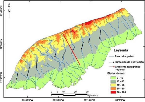 La distribución de los sedimentos aluviales, obtenida de los mapas geológicos y de suelo, también muestra la inflexión de los ríos hacia el SW; en la franja central las llanuras de inundación alcanzaron un gran desarrollo, lo cual se hace más evidente hacia la parte oriental. Probablemente los cambios de pendientes provocados por los movimientos neotectónicos obligaron a los cauces a cambiar constantemente de posición, lo que cuadyuvó a la acumulación de sedimentos aluviales. Otra zona anómala es la formada en la convergencia de los ríos Hondo, Ajiconal, Paso Viejo y Santa Clara. Aquí la llanura de inundación alcanza su máxima amplitud (7 km de ancho, aproximadamente), y los ríos Ajiconal y Paso Viejo rompen con el patrón regional de desviación hacia el SW, lo que es causado por el hundimiento ocurrido a lo largo de la discontinuidad tectónica que separa los bloques I y II.