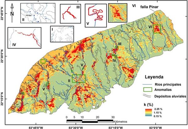 Las anomalías del canal de potasio muestran una clara correlación con el mapa de distribución de los sedimentos aluviales. El patrón de desviación sistemático de los ríos aparece como anomalías lineales de orientación SW, además se revela una amplia zona de sedimentos aluviales, al este del río Los Palacios; al parecer estos aluviones fueron quedando abandonados a medida que el río migró hacia el oeste, lo cual provocó la asimetría del delta formado. Además, la distribución de los sedimentos aluviales entre los ríos San Diego y Los Palacios indica la conexión hidráulica que existió entre estos cursos y que fue interrumpida por movimientos locales de ascenso. Finalmente, la espectometría del canal de potasio delimita bien los diferentes deltas formados a lo largo de la costa, muchos de los cuales no poseen una clara expresión en la configuración de la costa actual, por lo que este elemento permite definir la posición de la antigua línea costera.