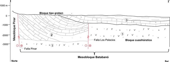 Iturralde-Vinent (1978, 1998) definió la existencia de dos tipos de bloques desde el Eoceno superior al Reciente. En esta región estos bloques estaban bien establecidos durante el Mioceno inferior y medio, como lo demuestran los resultados geofísicos y de las perforaciones, donde el horst meridional estaba levantado y no se depositaron sedimentos paleogénicos (Barrios et al., 1988). Los movimientos de ascenso del terreno comenzaron a dominar desde el Mioceno tardío (Iturralde-Vinent, 2003), lo que permitió que aflorara la Formación Paso Real (Oligoceno superior-Eoceno superior) y que la misma fuera sometida a intenso proceso de karstificación.