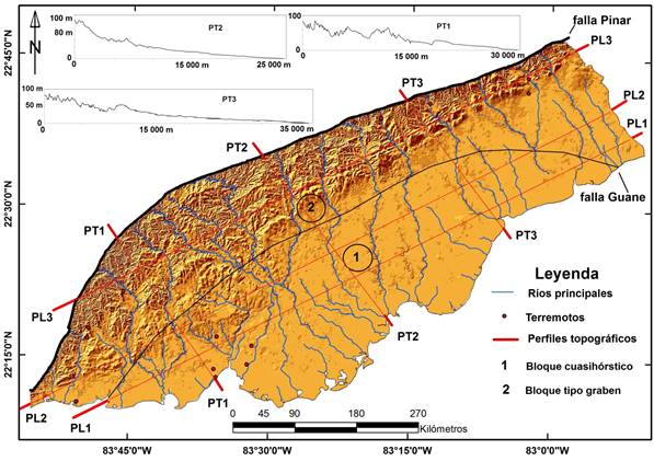En la década de los años 70 se realizó un importante número de investigaciones estructuro-geológicas en Cuba (Orbera y Cabrera, 1975; Orbera et al., 1975; Shein et al., 1976), todas complementadas con datos geofísicos y perforaciones, lo que permitió la primera división en bloques morfoestructurales de diferentes órdenes jerárquicos: megabloque, macrobloque, mesobloque y bloques menores. La llanura Sur de Pinar del Río se emplaza en el mesobloque Batabanó, limitado por los mesobloques Pinar y Habana-Matanzas, y controlado por el sistema de fallas Sur Cubano (Cabrera et al., 2012). A su vez, en la llanura sur de Pinar del Río se reportan velocidades de los movimientos verticales recientes del orden de +2.0 a +4.0 mm/año, de acuerdo con las investigaciones geodésicas de nivelaciones sucesivas (Lilienberg, 1984; Díaz y Lilienberg, 1989), los que influyen en la conformación del relieve actual. La existencia de diferentes morfoestructuras locales, anomalías en la red de drenaje y una costa con características de sumersión, que condiciona su naturaleza pantanosa, son elementos que apuntan a la existencia de estos movimientos (Marques et al., 1981; Barrios et al., 1988; Estévez et al., 2010).