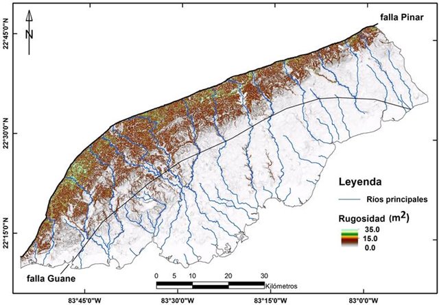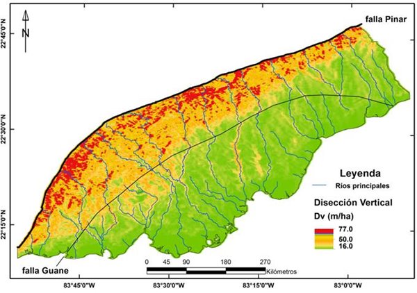 Algunas de las anomalías encontradas en la red de drenaje manifiestan una clara expresión en los mapas de disección vertical (Figura 4) y de rugosidad del relieve (Figura 5), especialmente las morfoestructuras locales positivas, situadas en las premontañas y en las cercanías de la falla Pinar, donde se manifiestan los mayores ascensos. Los valores de estos parámetros disminuyen hacia el extremo oriental de las premontañas. También resultan claramente contrastante los valores de estos parámetros en los sectores donde ocurre el atrincheramiento de los ríos.