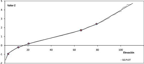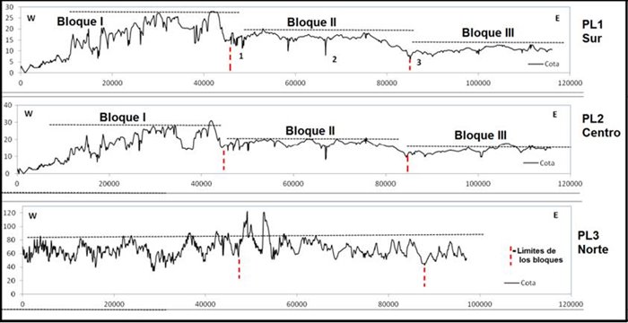 El análisis hipsométrico del relieve comenzó con el trazado de los perfiles transversales (Figura 3) y longitudinales (Figura 6), y la construcción de histogramas y del gráfico Q-Q (Cuantil-Cuantil) (Figura 7). Los perfiles topográficos (Sur, Centro, Norte) permitieron diferenciar tres bloques escalonados de oeste a este, con una reducción gradual de la altitud. Esta diferenciación del relieve en bloques es evidente en las partes meridional y central de la llanura, pero se atenúa en las proximidades de la falla Pinar. El límite entre los bloques I-II parece coincidir con una falla que canaliza al río Hondo, mientras que los bloques II-III se separan por una discontinuidad coincidente con el río Bacunagua. Para identificar puntos de inflexión, como indicadores de cambios bruscos en los valores de las cotas en la llanura, se construyó el gráfico Q-Q (Figura 7).