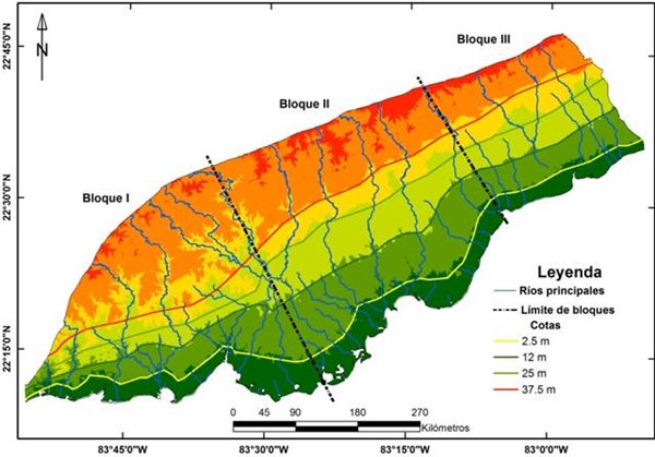 Las curvas de nivel generalizadas, que representan estos puntos de inflexión, se muestran en la Figura 8, los mismos separan zonas de la llanura, donde se manifiestan transiciones de las formas del relieve así como de los tipos de sedimentos. La curva +2,5 m, paralela a la costa actual, separa, a groso modo, los sedimentos marinos, formados en una costa de sumersión, de los de origen fluviomarino. La curva +12 m indica un claro escarpe de abrasión marina, bien expresado en el relieve, que coincide con la posición de una antigua línea de costa. Este escalón marca el inicio de la formación de los sedimentos deltaicos, que modelan la configuración actual de la costa. Esta isolínea cambia bruscamente su dirección hacia el NE y luego recupera su orientación original, como consecuencia del hundimiento del terreno en el extremo SE de la llanura. La curva +25 m muestra también un cambio brusco de orientación, pero este se manifiesta hacia el centro de la llanura, donde convergen los ríos Hondo, Santa Clara, Paso Viejo y Ajiconal. Hacia la parte oriental, la isolínea mantiene su rumbo y marca aproximadamente el límite entre los sedimentos de las formaciones Guane y Guevara.
