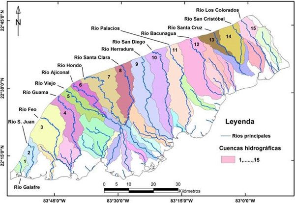 Para el estudio morfométrico del relieve se analizaron 15 cuencas hidrográficas dentro del perímetro de la llanura sur, especialmente las que desembocan directamente en la costa sur. En algunos casos, para estimar los índices morfométricos, se individualizaron subcuencas, como en los ríos Paso Viejo-Ajiconal, Hondo-Santa Clara y Santa Cruz-San Cristóbal (Figura 9).