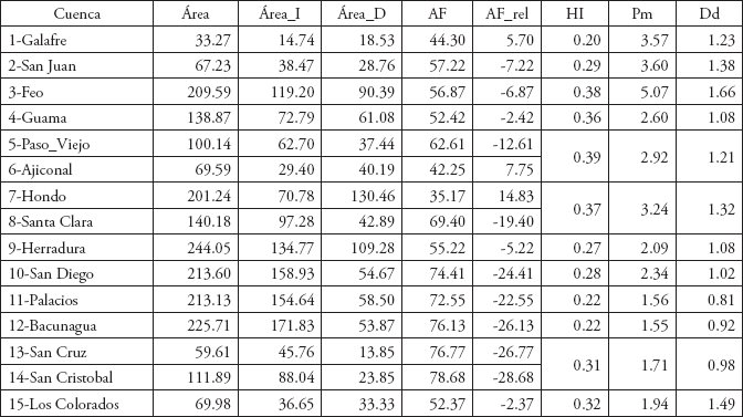 Los parámetros morfométricos calculados para las cuencas se muestran en la Tabla 1. Un elemento de interés son las asimetrías de las cuencas (AF y AF_rel), que muestran sus valores máximos en los ríos de la parte oriental de la llanura, entre el Santa Clara y el San Cristóbal, con la excepción del río Herradura, que por el valor de AF parece ser una cuenca casi simétrica.