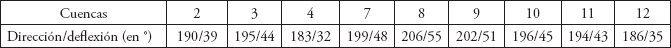 Además de la marcada asimetría, la mayoría de las cuencas hidrográficas muestran otro rasgo inusual y es la desviación sistemática de los cauces principales respecto a la dirección del gradiente topográfico regional de 151° (Figura 12). Esta anomalía, que se manifiesta en la parte axial de la llanura fue cuantificada, midiendo el ángulo de deflexión de los diferentes cauces (Tabla 2). Sus valores varían entre 32° y 55° con una media de 43,5°. Llama la atención la constancia de la deflexión, que es interrumpida solamente en las cuencas donde convergen los ríos Paso Viejo y Ajiconal.