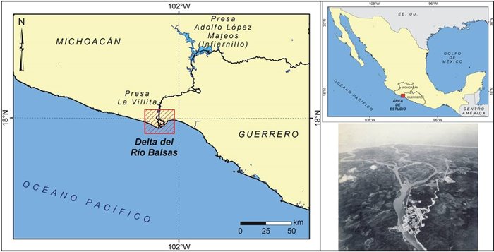 Por otra parte, Fregenal (2009) estudió el delta del río Ebro, uno de los grandes deltas mediterráneos, y lo clasificó como un delta con control mixto fluvial y del oleaje en contexto micromareal, aunque ha transitado a un sistema controlado por el oleaje como resultado de la reducción de su aporte sedimentario. Tomando en consideración estos criterios, el delta del río Balsas, localizado en el límite entre los estados de Guerrero y Michoacán, México, antes del año 1958 y sin la influencia antropogénica de la construcción de las presas “Infiernillo” y “La Villita”, que redujeron significativamente sus aportes sedimentarios, podía catalogarse como un delta del tipo de oleaje dominante, delineado por costas rectas, barreras bien desarrolladas y crestas de playas con notable continuidad lateral de sedimentos arenosos.