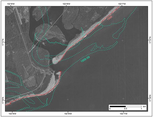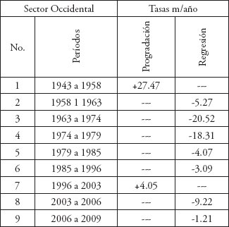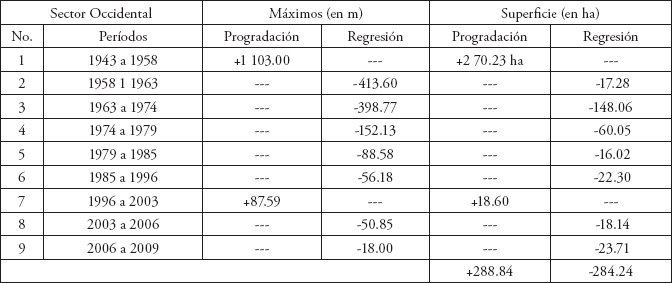 En el sector occidental, entre los años 1943 y 1958, se observó una tendencia notable en la progradación de la porción frontal del delta, del orden de +1 103 m (Tabla 3). En el ápice del delta, la línea de costa avanzó hacia el mar a un ritmo anual de +73.53 m/año.