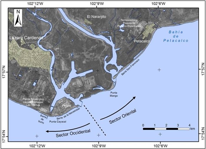El sector deltaico occidental presenta un litoral orientado con rumbo generalizado NW-SE, quedando comprendido entre el Estero Erendida, en el extremo poniente, y hasta la boca cegada Las Burras, incluyendo la porción frontal “Isla de En medio”, alcanzando la primera escollera de la entrada al puerto, con una longitud de 6.6 km. El sector deltaico oriental comprende desde la escollera izquierda de la entrada al puerto hasta el estero Barra Vieja, formando el flanco poniente de la bahía abierta de Petacalco. Este último sector posee una longitud de 7.8 km y ambos alcanzan una longitud total de 14.3 km (Figura 2).