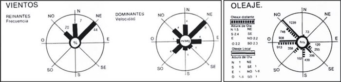 La vulnerabilidad de la costa está en función de su exposición y nivel de susceptibilidad a los procesos hidrodinámicos del oleaje. Según Puertos Mexicanos (1991), en el Puerto Lázaro Cárdenas los vientos dominantes provienen principalmente del norte, noreste y noroeste, con velocidades máximas de 4 a 9 m/seg (Figura 3). Este flujo se origina sobre el continente y fluye, de manera confinada, por el abra de El Infiernillo, que corta la barrera orográfica de la Sierra Madre del Sur. Este régimen imposibilita correlacionar los vientos con la dirección del oleaje, aunque los flujos provenientes del noroeste influyen en la dinámica litoral del sector deltaico occidental, orientado en esa misma dirección.