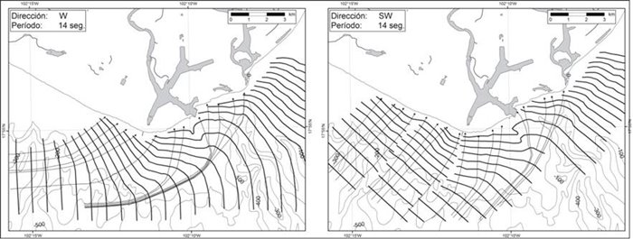 De acuerdo con los registros estacionales del oleaje (Puertos Mexicanos, 1991), en primavera el oleaje reinante proviene del oeste; en verano, del sur y oeste; y en otoño e invierno, del oeste-suroeste, sur y sureste. Desde luego, la localización abierta del delta frente al océano Pacífico está expuesta a la influencia dominante del oleaje distante, aquel que se genera a 5 000 km o más de distancia, con un régimen anual de procedencia oeste (Figuras 4 y 5). La amplitud media de la marea máxima es de 0.54 m, que equivale a la más baja de la costa del Pacífico mexicano (Puertos Mexicanos, 1991).