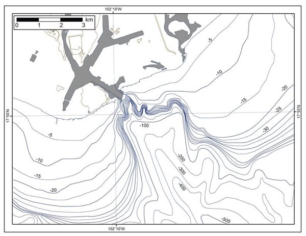 Los tramos de litoral sujetos a una erosión constante son los correspondientes a la Isla de En Medio (Toledo y Bozada, 2002) y la costa de Cayacal, entre los dos distributarios del delta. Incluso, considerando otros rumbos de procedencia del oleaje, los canales de energía se concentran en los mismos sitios, al estar controlados por la configuración batimétrica de la cabecera del Cañón La Necesidad (Figura 6). La cabecera de este cañón forma parte del canal de acceso al puerto, con 18 m de profundidad y un ancho de 200 m (Toledo, 2003a). Esta condición propicia el avance, por erosión remontante, de la incisión del cañón submarino hacia el puerto, la que se favorece, a su vez, por la ocurrencia de deslizamientos en el talud continental del delta submarino (Oliva y García, 1987; Sandoval y Aguayo, 2006).