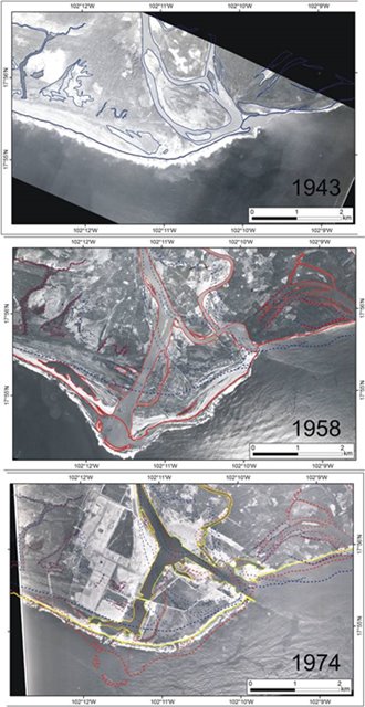 La tendencia al proceso regresivo de la costa se mantuvo entre los años 1974 al 1979, y 2003 al 2006, con tasas de regresión costera de -15.28 m/año y -14.45 m/año, respectivamente. En la Figura 7 se observan los cambios del frente deltaico en tres momentos: a) año 1943, configuración original del delta; b) año 1958, inicio de las construcciones para la hidroeléctrica “El Infiernillo”, y c) año 1974, impacto de las hidroeléctricas y de los cambios de uso de suelo.