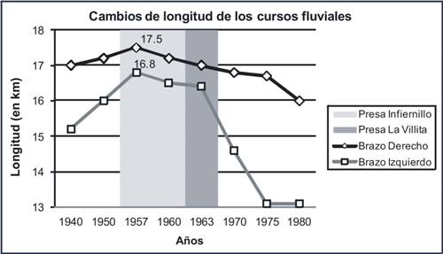 Realmente son muy notables los cambios en las tendencias de los procesos fluviales a partir del impacto provocado por las obras hidráulicas en el tercio inferior del río. Poco antes del inicio de las obras, los brazos de los ríos distributarios registraban un alto valor de longitud de 17.5 y 16.8 km, respectivamente (Figura 8), para disminuir bruscamente, una vez que la carga del escurrimiento sólido es controlada por los embalses, particularmente en el distributario izquierdo, que es el de mayor caudal.