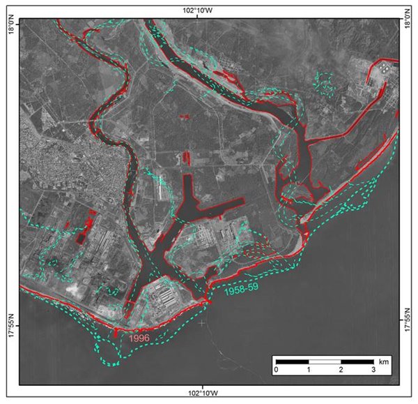 En este sentido, el presente trabajo está enfocado al análisis de las variaciones espacio-temporales de la línea costera en el delta del río Balsas, en el Pacífico mexicano, dado que en ciertas porciones su costa es muy inestable y la dinámica litoral ha modificado constantemente su traza. La identificación y evaluación de este fenómeno se realizó mediante la fotointerpretación de imágenes aéreas de diferentes épocas (años 1943, 1958-1959, 1963, 1974, 1976-1977, 1981-1982, 1985, 1996, 2006 y 2009) y de la cartografía histórica comparativa (años 1964, 1980, 1990, 1998, 2001 y 2003). El objetivo central es conocer cuáles sectores de la costa deltaica presentan regresión o progradación, calculando los desplazamientos de la línea de costa, a través del análisis retrospectivo durante los últimos 66 años (1943-2009).