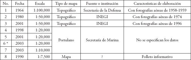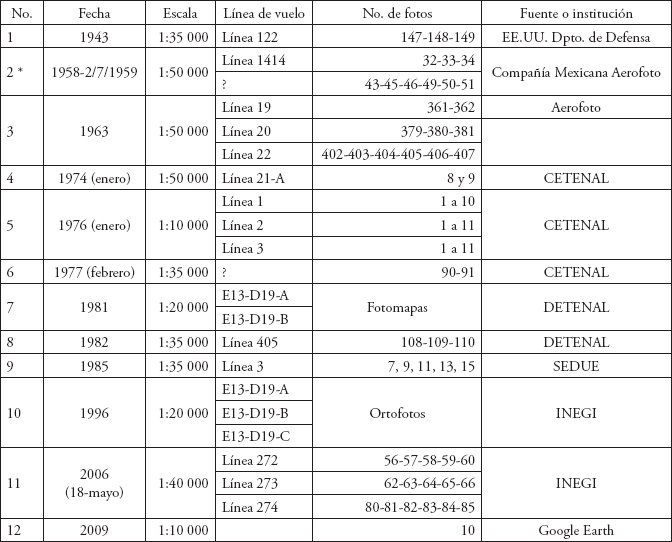 El material básico de análisis consistió en series de fotografías aéreas que cubrieron la llanura deltaica en diferentes fechas de vuelo. Se contó con las fotografías aéreas más antiguas, de tipo trimetrogón, de 1943, consultadas en el Instituto de Geografía de la UNAM, hasta las imágenes obtenidas de Google Earth del 2009 (Tabla 1). De cualquier forma, antes de extraer datos de estas fuentes es necesario subrayar la importancia de definir la línea de costa a utilizar y evaluar la precisión geométrica de dichas fuentes de información para establecer la escala espacial del análisis (Ojeda, 2000).