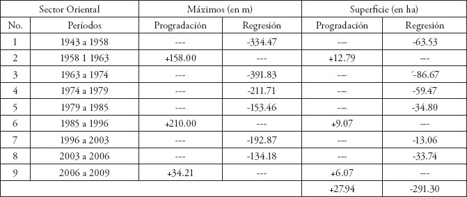 La fase regresiva en el sector oriental del delta es notoria, si la comparamos con los cambios en el sector occidental. El valor extremo más significativo ocurre en el período comprendido entre 1963 y 1974, con una pérdida superficial de playa de 86.68 ha, lo que indica una tasa promedio de retroceso costero de -10.12 m/año (Tabla 6).