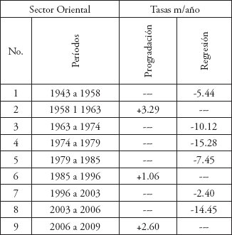En el sector oriental del frente deltaico predominó el proceso de regresión en todos los períodos analizados, sobre todo entre los años 1963 y 1974, cuando aún el litoral del delta carecía de una protección eficaz. En esos años la regresión máxima de la costa alcanzó -391.8 3 m (Tabla 5). Posteriormente, en 1979, se inician las obras de espigones y escolleras, lo que redujo el impacto erosivo del oleaje. Estas protecciones costeras marcaron una tendencia sostenida a la reducción de la erosión hasta el año 2009, con una tasa promedio de -1.45 m/año.