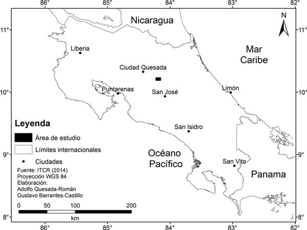 El área de estudio comprende una sección de 52 km2 de la ladera noreste del volcán Poás, en las coordenadas geográficas extremas 10.23 N y 10.18 S, -84.23 W y -84.14 E (Figura 1). Se localiza en una fractura volcano-tectónica alineada de norte-sur, donde se ubican su foco eruptivo, los conos piroclásticos de Sabana Redonda, el cono Botos, el cono Von Frantzius, el volcán Congo y los maares de Hule y Río Cuarto (Ruíz et al., 2010).