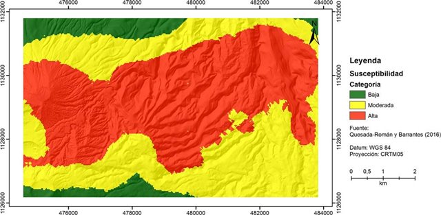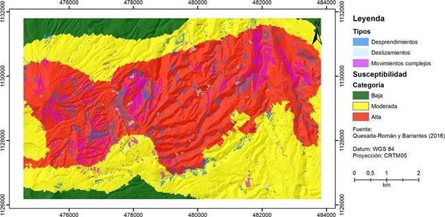 De acuerdo con la Figura 3, la zona de baja susceptibilidad se asocian a áreas de pendientes menores a 20°, donde no es de esperar la ocurrencia de eventos. No obstante, su aparente equilibrio geomórfico se ve interrumpido por la presencia de valles fluviales profundos, que podrían desarrollar flujos de lodo dada la presencia de depósitos piroclásticos y lavas meteorizadas. Asímismo, la erosión lateral en los márgenes de los afluentes, como el caso de los ríos La Paz y Sarapiquí, puede propiciar remoción en masa. Las zonas de moderada susceptibilidad tienen como característica principal que su geodinámica mezcla formas de relieve que poseen tanto procesos dominados por la erosión como la disección de cauces fluviales, la presencia de fallas y fracturas en sustratos geológicos, como las Unidades Río Sarapiquí, Colima o Andesitas La Paz, de más de 500 ka, los cuales presentan una fuerte meteorización y favorecen el desarrollo de procesos de ladera puntuales como los desprendimientos, deslizamientos e incluso flujos de lodo. Las zonas de alta susceptibilidad se distribuyen hacia el centro del área de estudio, donde las pendientes se mezclan desde menores a 20° asociadas con divisorias de aguas, las rampas piroclásticas y el Complejo volcánico Poás, hasta las que superan con facilidad los 40° vinculadas a los profundos cañones de hasta 360 m de profundidad, intensos valores de energía del relieve de hasta 410 m y datos de erosión total de hasta 52 kilómetros lineales cada 500 m2. En estas zonas es muy probable el desarrollo de deslizamientos, desprendimientos, flujos de lodo y movimientos complejos.